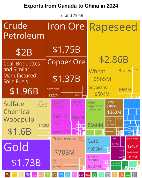 As a band-aide to these economic problems, both in Canada and the US, we have caught to raise government income through a new tax, tariffs. We’ve each put 25% tariffs on automobiles produced in the neighboring country. But Canada has a twist, it can benefit bringing bringing in high-tariff and prohibited imports from China and Cuba hoping the imports cross the border to the US. For example, they import Cuban cigars, and sell them near the border at inflated prices to Americans (largely) who smuggle them to the US. It worked too during prohibition for whiskey. In the last month, Canadian PM Carney reduced the tariff on 50,000 China-made EVs to 6.1%. If large numbers find their way to the US as new or used vehicles, the hope is that Chinese companies will buy manufactured goods from Canada, or evenest up manufacturing. It might work, though Cuba never set up cigar manufacturing in Canada. Typically Chinese companies send abroad nearly finished items, allowing the host country to add finishing touches that involve no technology but that can be claimed to raise the value significantly to avoid taxes. As the chart above, China imports from Canada are virtual all raw goods: food, petroleum, iron ore, gold… Technological expertise stays at home. Canada will need a home grown engine to get out of its funk.