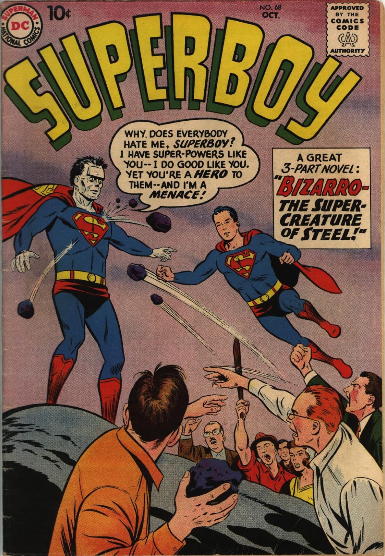 Another favorite super villain was Bizzaro Superman. He was a Superman variant of another planet or dimension and , as seemed perfectly reasonable, he has a completely opposite morality from Superman. He’s happy go lucky, robs banks and does other crimes (why would you think otherwise — it’s normal on his planet.) Interestingly, Bizzaro does not keep his head up, and has none of Superman’s charisma, Bizzaro is there, I think, to emphasize the fantasy of Superman’s non-disguise and semi-human morality. And as such he was a favorite.
