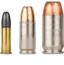 Size comparison; 22, 9mm, 45. Big bullets leave big holes.