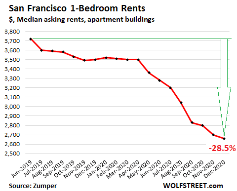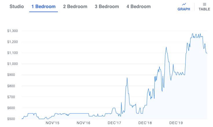 As things stand, the suburbs and smaller cities are the beneficiaries of the exodus. Among the cities benefiting the most are cities in the south and mid-west: states that are more open and are relatively low cost: Phoenix, Oakland, Cleveland, St. Petersburg, and even Detroit. Detroit’s rents were already moving up as auto manufacturing returned from Mexico, see chart. Between early 2017 and October 2020, they went from $500/month to $1250/month for a 1 bedroom apartment, according to Zumper. Detroit rents fell after election day, but are still up 20% on the year. The influx of wealthier working folk to Detroit is welcome to some, unwelcome to tenants who find their rents are raised. I think it’s is a sign of a healthy economy that people follow life-quality, and that rents follow people. Our landlords are happy, but there are a lot of Detroit renters who are not