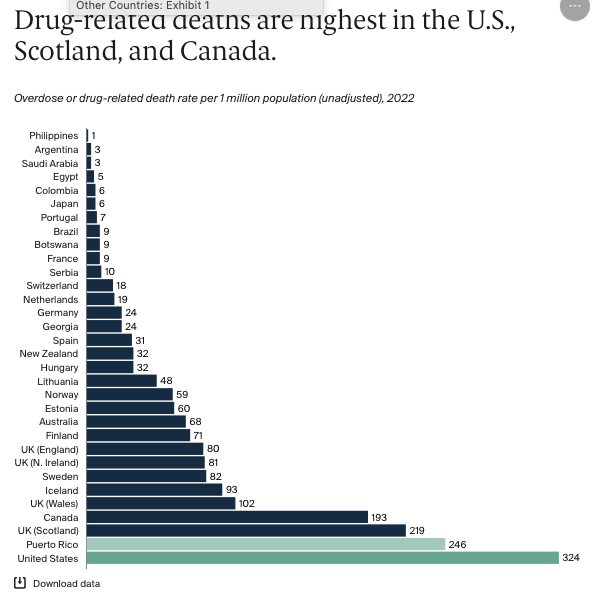 Before we compliment ourselves, our drug overdose numbers are still vastly too high, about 70,000 deaths in 2025, a vastly higher rate than in Europe or Japan, see chart below. The reason is, in my opinion, that we are over-diagnosed and over-medicated. We see ads for drugs of every sort on TV or in magazines telling us to ask for a pill for every sort of pain. They are all addictive. Doctors are happy to comply, and when the prescription stops, or stops being as effective as you’d like, you become a customer for heroin or fentanyl.