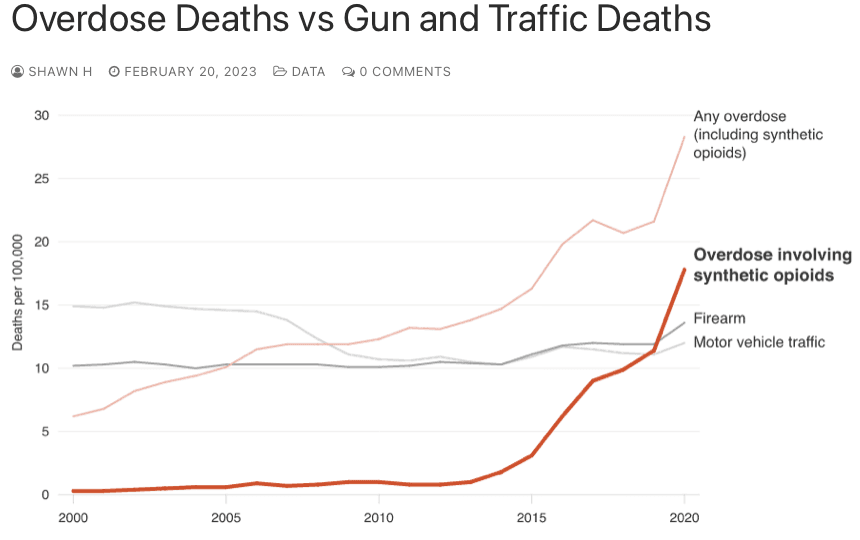 Opioid overdose deaths have exceeded gun or vehicle deaths since 2005. But there has been a big uptick since the introduction of synthetic opioids, about 2014. Fentanyl is now the leading cause of overdose deaths, alone outpacing gun and vehicle deaths, see graph.