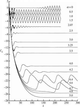 Numerical lift coefficients versus time, seconds for different ratios of surface speed to wind speed, a. (Mittal & Kumar 2003), Journal of Fluid Mechanics.