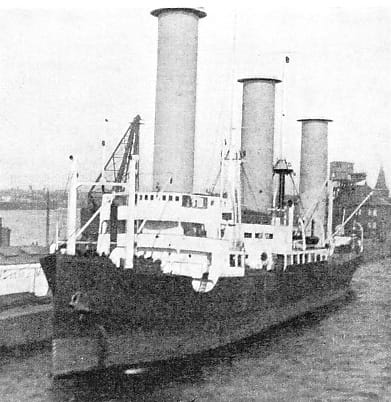 Sailing ships are wonderfully economic and non-polluting. They have unlimited range because they use virtually no fuel, but they tend to be slow, about 5-12 knots, about half as fast as Diesel-powered ships, and they can be stranded for weeks if the wind dies. Classic sailing ships also require a lot of manpower: many skilled sailors to adjust the sails. What’s wanted is an easily manned, economical, hybrid ship: one that’s powered by Diesel when the wind is light, and by a simple sail system when the wind blows. Anton Flettner invented an easily manned sail and built two ships with it. The Barbara above used a 530 hp Diesel and got additional thrust, about an additional 500 hp worth, from three, rotating, cylindrical sails. The rotating sales produced thrust via the same, Magnus force that makes a curve ball curve. Barbara went at 9 knots without the wind, or about 12.5 knots when the wind blew. Einstein thought it one of the most brilliant ideas he’d seen.