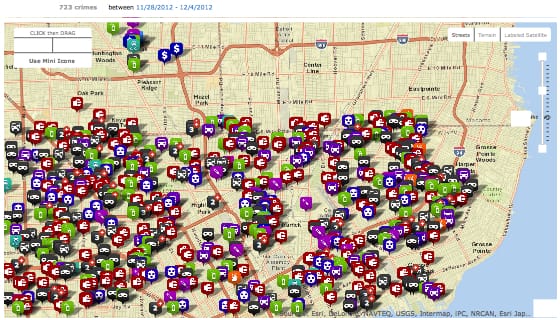 1 week of crime in Detroit with special focus on 8 mile road — that’s the horizontal cut dividing Detroit, lower from the northern suburbs. The crime area in the upper right is Royal Oak.