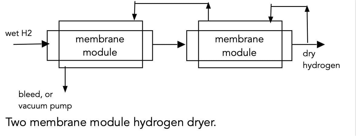 One more example where drying hydrogen is important, is for its use in high altitude balloons. At high altitudes, water can condense, changing the lift characteristics, and perhaps freezing and puncturing the balloon. For all these applications, I suggest use of a silicone polymeric membrane operated as dryers, using a counter current flow as shown below. We sell these at REB Research, see here. These membranes also remove CO2, silanes, and H2S.