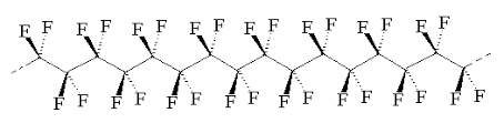 When I was eight or nine year old, I went to the 1963-64 World’s Fair in New York. Among the attractions, in “the kitchen of the future”, I saw the first version of an amazing fry-pan that was coated with plastic. You could cook an egg on that plastic without any oil, and the egg didn’t stick. The plastic was called teflon, a DuPont innovation, whose molecule is shown below.