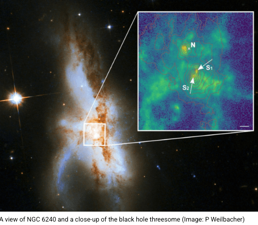 If our galaxy had many many black holes could it be stable? Could it have lasted as long as it has. One thought is we’re doomed. The galaxy NGC6240 contains three large black holes rotating among themselves, see picture. Their dance seems to be destroying the galaxy as we watch. A possible way out of this appears in a recent video blog by Sabine Hossenfelder based on a paper saying the black holes may not be black holes at all, but clouds. I’m not sure that makes things any more stable, but I enjoyed the video content, so I linked to it.