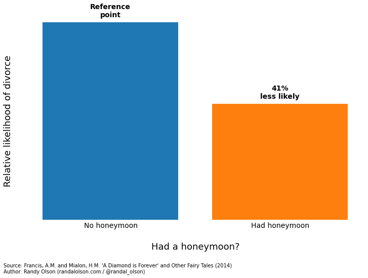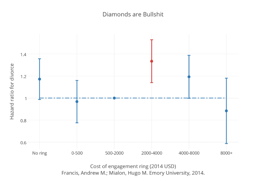 Statistics suggest that spending on the diamond doesn’t help either, unless it’s a very expensive stone — and that, perhaps, is because the very expensive stone is only bought by the very rich groom. Still, even for the 1% who can afford it, the dress or stone should be considered a sunk cost, not an investment. You’ll never be able to resell that dress at all, and though you can resell a diamond it is virtually impossible to get even half your money back. This isn’t to say that you should not give a ring — without a ring the bride will feel cheated, but most grooms will be better served giving one in the $100-$2000 range.