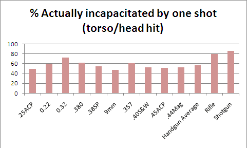 An analysis of what percent of people stop attacking when hit by one bullet of different calibers. The 32 and shotgun are the best, in part because the shooter tends to stop shooting at one shot. With a 9 mm, the shooter keeps on shooting, likely doing more damage than necessary.