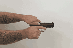 It takes two hands to cock a semi-automatic, that is to draw the first round into the chamber. Gif from ammuniotndepot.com