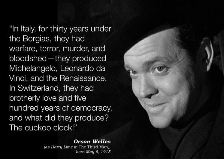 Writing all this reminds me that the fundamental assumption that progress is good, in not necessarily true. I quote above a line that Orson Wells, as Harry Lime, ad-libbed for the movie, “The Third Man.” Lime points out that innovation goes with suffering, and claims that Switzerland had little innovation because of its stability. Perhaps then, what you really want is the stability and peace of Switzerland, along with the lack of domination and innovation. On the same note, I’ve noticed that engineering innovators often ruin themselves dining in ruin, while the peaceable, stable civil engineers live long pleasant lives of honor.