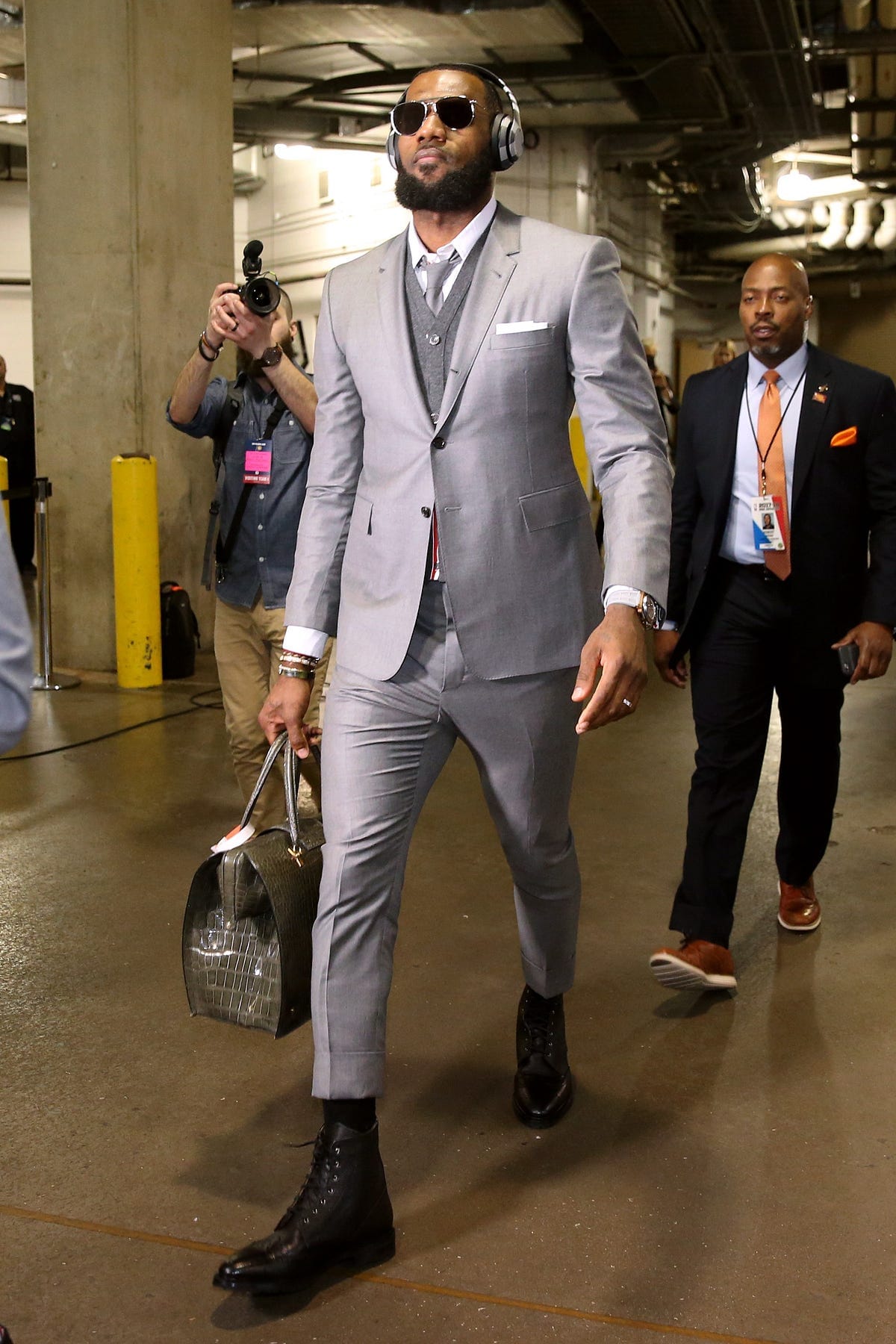 LeBron James, at right, is wearing a complete mens, anti-Trump look, likely a Thom Browne suit, a very expensive ill fit. This suit doesn’t look comfortable, but it’s fashion, and as I’ve said before, you’ve got to suffer for fashion.