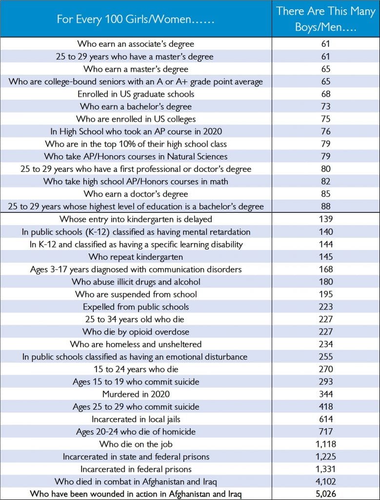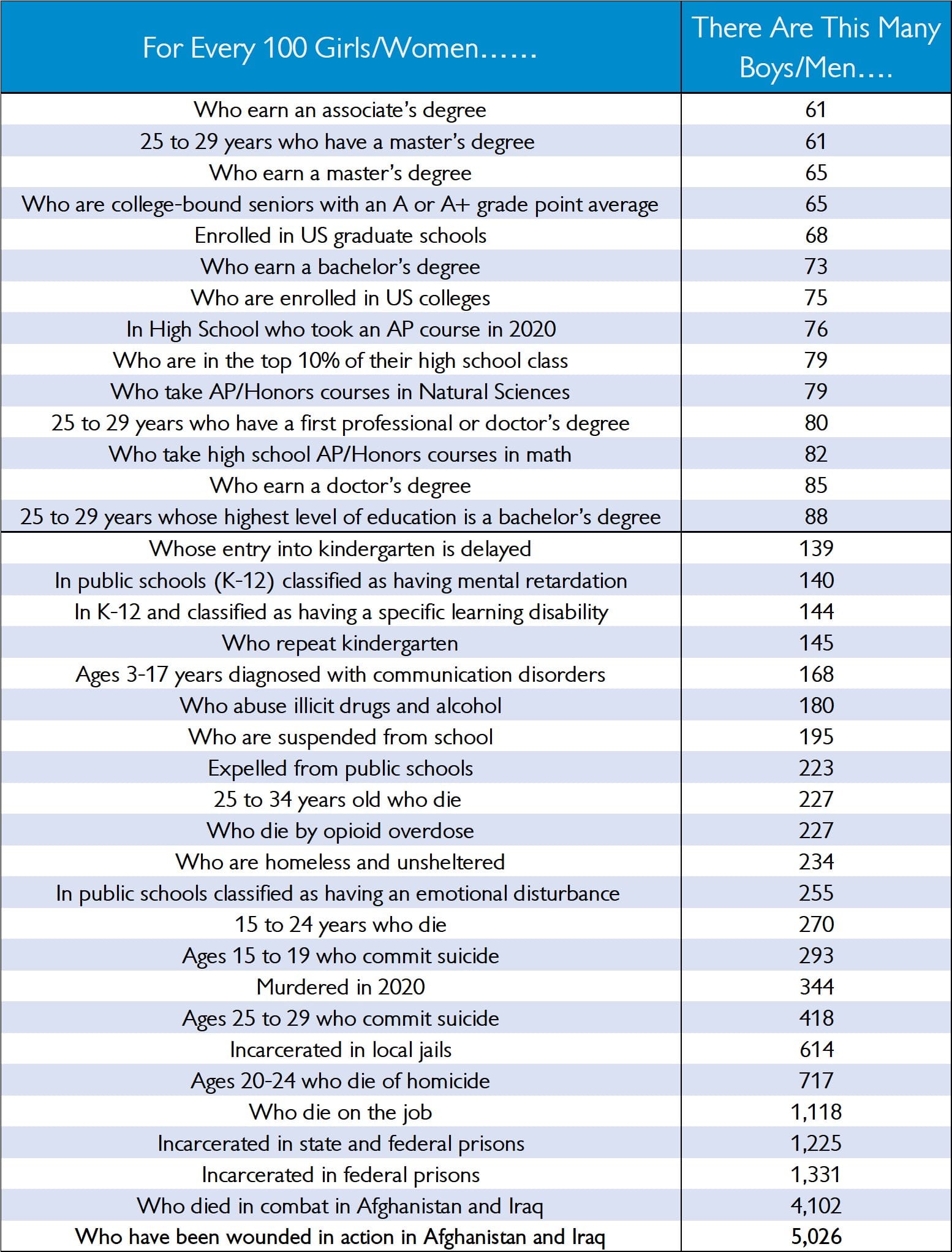 When I began college in 1972, the majority of engineering students and business students were male. They from the top of their high school classes, and from stable homes mostly; they went on to high paying jobs. Boys also dominated at the bottom of society. They were the majority of the criminals, drug addicts, and high-school dropouts. Many went off to Vietnam. Some, those who were handy, went to trade schools and a reasonable life, productive life. Society did not seem bothered by the destruction of boys in prison, or Vietnam, or by drugs, but there was an outcry that so few women achieved high academic levels. A famous presentation of the problem was called “for every 100 girls.” An updated version appears below showing the status as of October, 2021. A more detailed version appears further down.