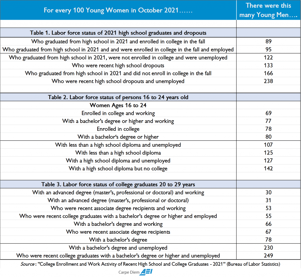 Source: National Center for Education Statistics - For every 100 women who are recent college graduates but not in the labor force, there are 108 men.
