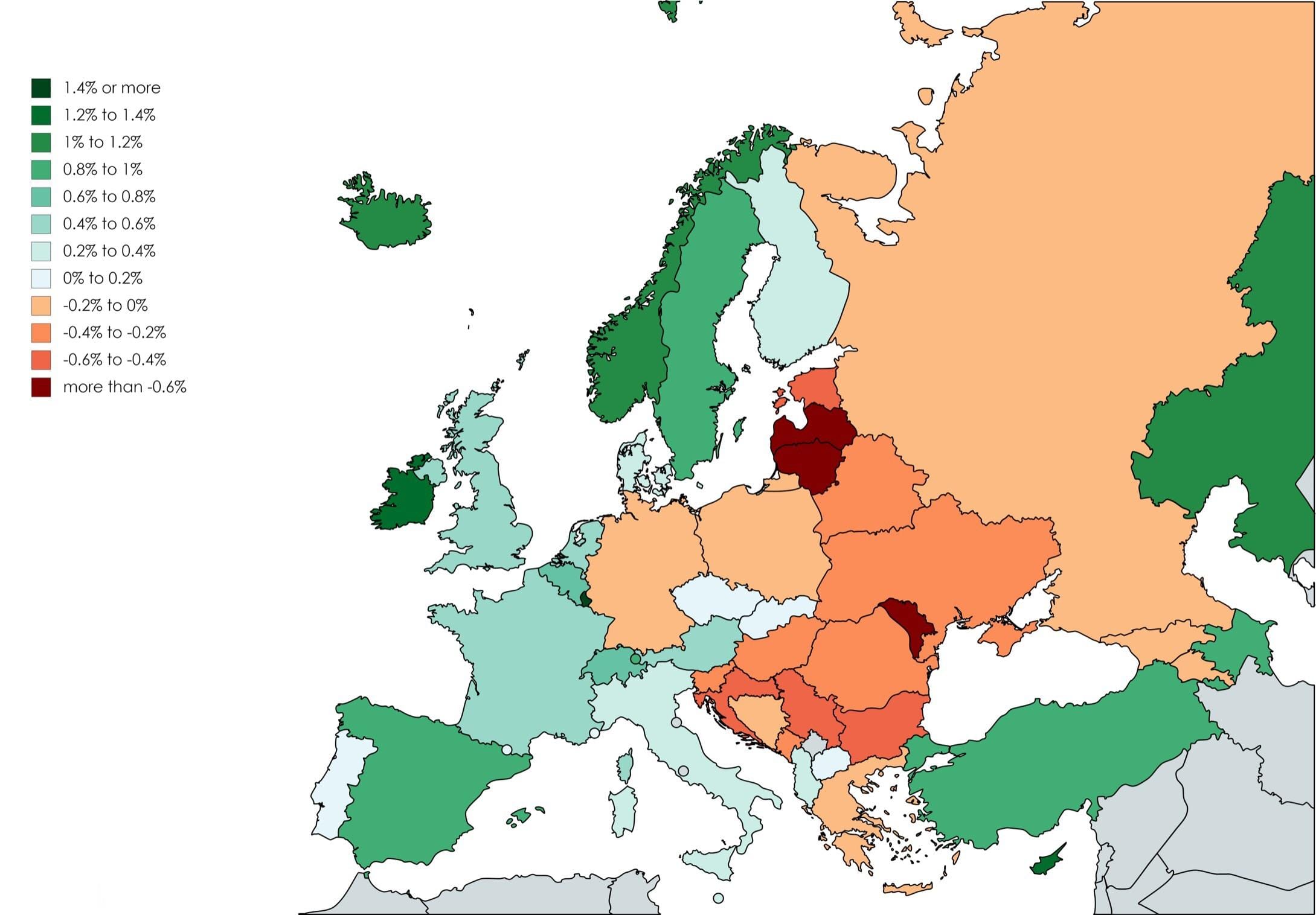 Population growth (green) or decline (orange) in Europe