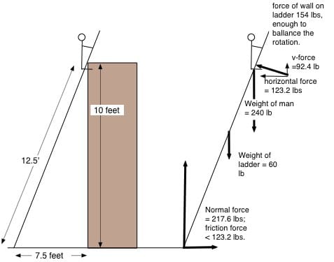 Perhaps the following analysis will help. Lets assume that the ladder is 12.5′ long and sits against a ten foot ledge, with a base 7.5′ away from the wall. Now lets consider the torque and force balance at the bottom of the ladder. Torque is measured in foot-pounds, that is by the rotational product of force and distance. As the fellow climbs the ladder, his weight moves further to the right. This would increase the tendency for the ladder to rotate, but any rotation tendency is matched by force from the ledge. The force of the ledge gets higher the further up the ladder he goes. Let’s assume the ladder weighs 60 lbs and the fellow weighs 240 pounds. When the fellow has gone up ten feet up, he has moved over to the right by 7.5 feet, as the diagram shows. The weight of the man and the ladder produces a rotation torque on the bottom of 60 x 3.75 + 240 x 7.5 = 1925 foot pounds. This torque is combatted by a force of 1926 foot pounds provided by the ledge. Since the ladder is 12.5 feet long the force of the ledge is 1925/12.5 = 154 pounds, normal to the ladder. The effect of this 154 lbs of normal force is to push the ladder to the left by 123.2 lbs and to lift the ladder by 92.4lbs. It is this 123.2 pounds of sideways push force that will cause the ladder to slip.