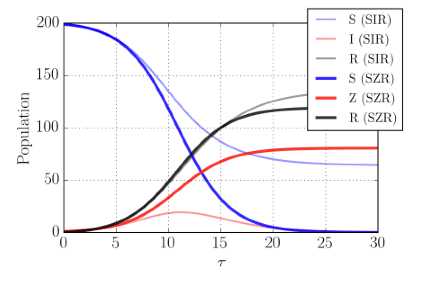 Fig. 1, Dynamics of a normal plague (light lines) and a zombie apocalypse (dark) for 199 uninfected and 1 infected. The S and R populations are shown in blue and black respectively. Zombie and infected populations, Z and I , are shown in red; k/ß = 0.6 and τ = tNß. With zombies, the S population disappears. With normal infection, the infected die and some S survive.