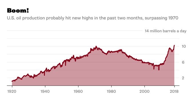 Just when you thought US oil had beed depleted for good, production began rising. It's now higher than the 1970 peak.
