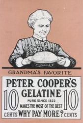 Cooper was a strong family man who made sure to own his own business, and made sure to control the sources of key materials too. He liked to invest in other businesses, but only as the controlling share-holder, or as a bond holder, believing that minor share-holders tend to be cheated. He was pro monopoly, pro trusts, and a big proponet of detailed contracts, so everyone knew where they stood. A famous invention of Cooper’s was Jello, a flavored, light version of his hide-glue, see the patent here. Besides patenting it, he sold the product with his brand, thus helping to maintain the monopoly.