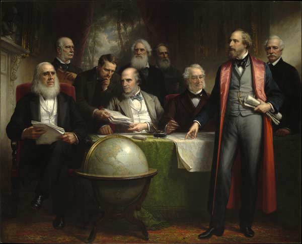 A few months after the failure, a friend of Cooper’s, Cyrus Field, convinced Cooper that good money could be made, and public good could be done, if Cooper could lay such a cable all the way to London. One thing that attracted Cooper to the project was that the cable could be made as an insulated iron-copper rope in Cooper’s own factory. Cooper, Field, and some partners (see painting below) bought Gisborne’s company, along with their exclusive rights, and formed a new company, The New York, Newfoundland & London Telegraph Company, see charter here. The founders are imagined* with a globe and a section of cable sitting on their table. Gisborne, though not shown in the painting, was a charter member, and made chief engineer. Cooper was president. He also traveled on the boat with Gisborne to lay the cable across the St. Lawrence – just to be sure he knew what was going on. This cable provided a trial for The Trans Atlantic cable.