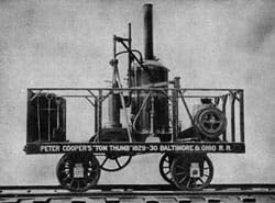 The list of inventions he didn’t patent include the instruments to test the quality of glue and steel (quality control is important), and a tide-powered ferry in New York. Perhaps his most famous unpainted invention was a lightweight, high power steam locomotive, “The Tom Thumb”, made in 1840. Innovations included beveled wheels to center the carriage on its rails, and a blower on the boiler fire, see photo above. The blower meant he could generate high-power in a small space at light weight. These are significant innovations, but Cooper did not foresee having a monopoly, so he didn’t pursue these ideas. Instead, he focussed on making rails and wire rope; he patented the process to roll steel, and the process for making coke from coal. Also on his glue/jello business. Since he made these items from dead cows and horses, he found he could also sell “foot oil” and steam-pounded leather, “Chamois”. He also pursued a telephone/ telegraph business across the Atlantic, more on that below, but only after getting monopoly rights for 50 years.