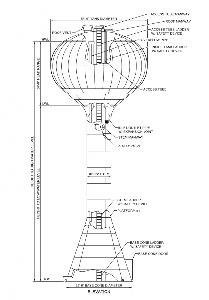 The typical tower stands at the highest point in the town, with the water level about 170 feet above street level. It’s usable volume should be about as much water as the town uses in a typical day. The reason for the height has to do with the operating pressure of most city-level water pipes. It’s about 75 psi and each foot of water “head” gives you about 0.43 psi. You want pressures about 75 psi for fire fighting, and to provide for folks in apartment buildings. If you have significantly higher pressures, you pay a cost in electricity, and you start losing a lot of water to leaks. These leaks should be avoided. They can undermine the roads and swallow houses. Bob Dadow estimates that, for our water system the leakage rate is between 15 and 25%.