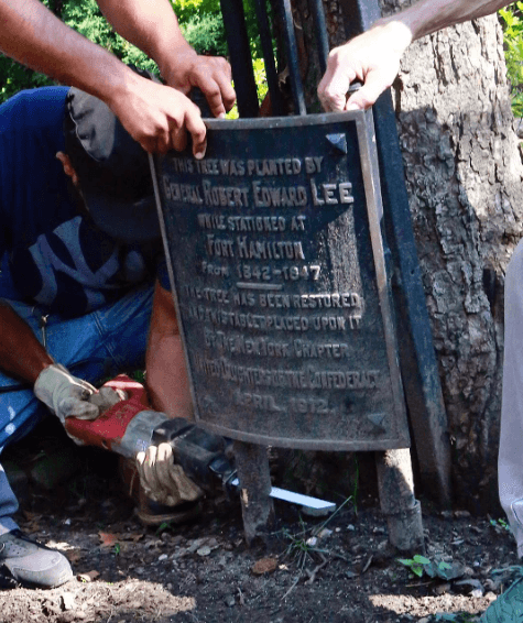 General Lee planted a maple tree on this spot in Fort Hamilton, New York. in 2017 the plaque is removed as offensive.