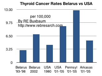 A hotly debated issue is whether radiation too has a hormetic dose range. In a previous post, I noted that thyroid cancer rates down-wind of the Chernobyl disaster are lower than in the US as a whole. I thought this was a curious statistical fluke, but apparently it is not. According to a review by The Harvard Medical School, apparent health improvements have been seen among the cleanup workers at Chernobyl, and among those exposed to low levels of radiation from the atomic bombs dropped on Hiroshima and Nagasaki. The health improvements relative to the general population could be a fluke, but after a while several flukes become a pattern.