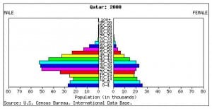 Qatar demographic pyramid. The imbalance is caused by the presence of vastly more male than female foreign workers.