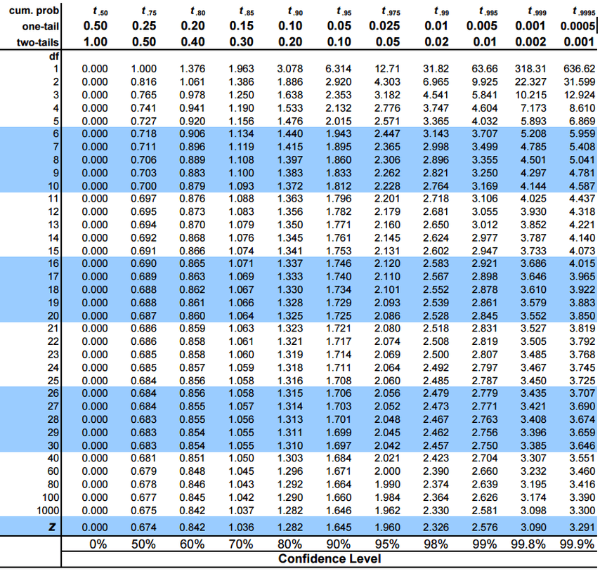 Now, go to your T-table and look up the T value for two tailed tests at 95% certainty and N = n° + n*. You probably learned that you should be using degrees of freedom where, in this case, df = N-2, but for normal group sizes used, the T value will be nearly the same. As an example, I’ll assume that N is 80, two groups of 40 subjects the degrees of freedom is N-2, or 78. I you look at the T-table for 95% confidence, you’ll notice that the T value for 80 df is 1.99. You can use this. The value for 62 subjects would be 2.000, and the true value for 80 is 1.991; the least of your problems is the difference between 1.991 and 1.990; it’s unlikely your test is ideal, or your data is normally distributed. Such things cause far more problems for your results. If you want to see how to deal with these, go here.