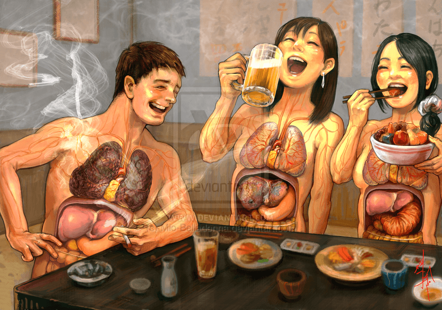 At first glance it’s an advertisement against smoking, drinking, and eating sweets. The smoker has blackened lungs, the drinker has an enlarged liver, and the eater of sweets a diseased stomach. But something here isn’t right; the sinners are happy and young. These things are clearly bad for you but they’re enjoyable too and “cool” — Smoking is a lot cooler than sucking on a carrot.