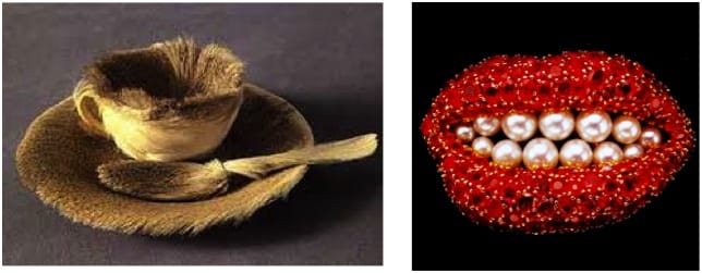 Meret Oppenheim’s fur tea-cup (Breakfast in fur) and Dali’s ruby lips; the same idea (I think); dada vs surreal.