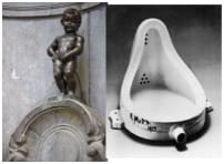 Any mention of dada should also, I suppose, mention Duchamp’s fountain (at right, signed fancifully by R. Mutt). In 2004, fountain was voted “the most influential artwork of the 20th century” by a panel of artists and art historians. The basic idea was to show the slight difference between art and not-art (to be something, there has to be a non-something, as in this joke). Beyond this, the idea would be that same as for the Manikken Pis sculpture in Brussels. Duchamp’s was done with a lot less work — just by signing a “found object.” He submitted the work for exhibition in 1917, but it was rejected as not being art — proving, I guess, the point. Fountain is related to man: his life, needs, and vain ambitions; it’s sort-of beautiful, so why ain’t it art? (It has something to do with skill, I’d say.)
