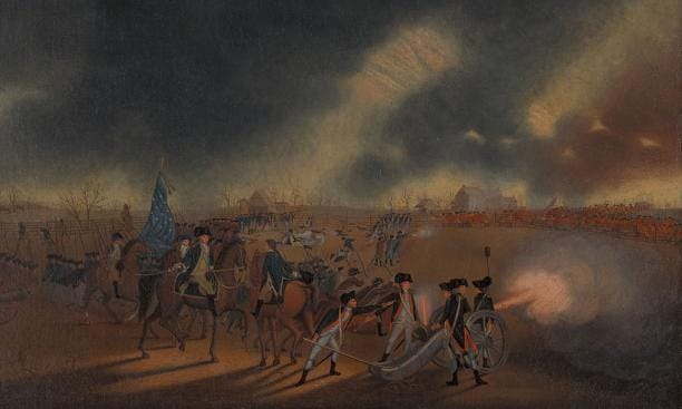 In fact, what Cornwallis did, is what every commenter recommended. He attacked at Trenton, and lost New Jersey. Cornwallis left 2-3000 troops at Princeton and marched south. Despite fallen trees, swollen rivers, destroyed bridges — all courtesy of Washington’s men –Cornwallis reached Trenton and attacked. By the time he got there, 2000 of Washington’s men had left, partially replaced by untrained militia. After a skirmish, Washington set up 400 militia to keep the fires burning, and without telling them where he was going “Fall back if the British attack”, he took the rest of his forces east, across frozen fields and swampland, then north to Princeton along the Quaker-bridge road. He later said the reason was to avoid looking like a retreat.